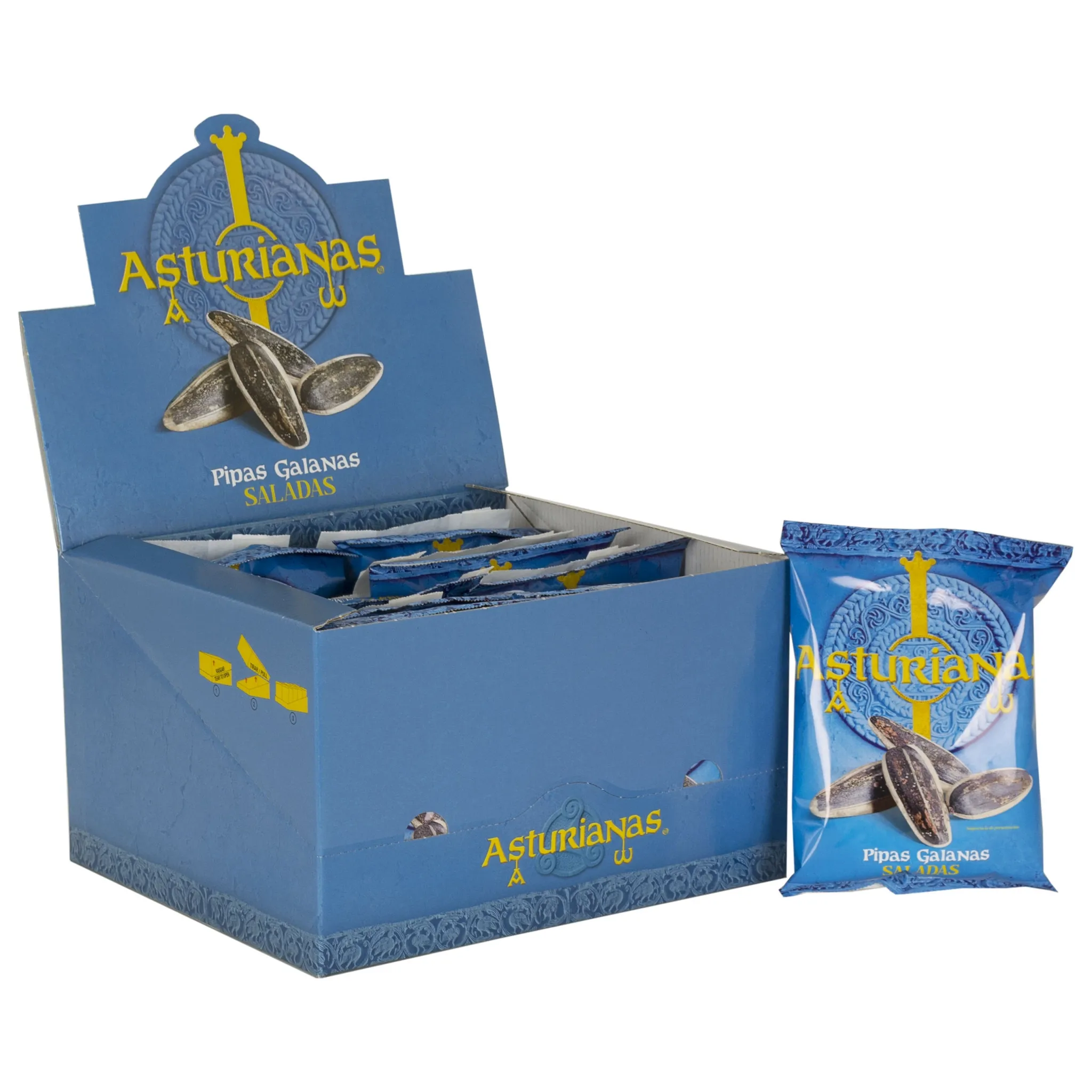 Exquisitas y crujientes pipas de girasol saladas y tostadas, en bolsas de 120 g. de la Marca Asturiana, en la parte posterior se pueden depositar las cáscaras, gracias a otra bolsa adosada a tal efecto. Caja de 10 unidades de 120 g.